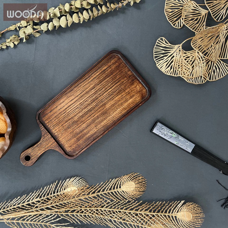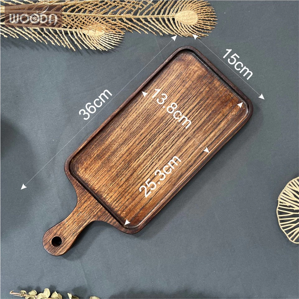 Khay chữ nhật ngắn có tay cầm tròn màu nâu, khay gỗ cao cấp có tay cầm 15x36cm